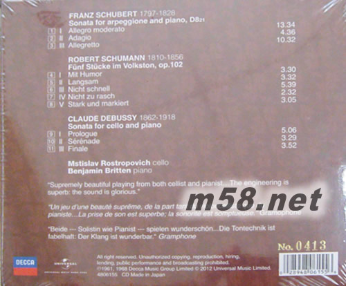 Schubert/Schumann/Debussy 24K金 限量版(m58.net) 大提琴家 Rostropovich 羅斯特羅波維奇 聯同Britten 布列頓爵士,演奏 舒伯特,舒曼等優美樂章 24 Bit X 24K Gold X 日本版 全球限量盤1000件附珍貴限量編碼.