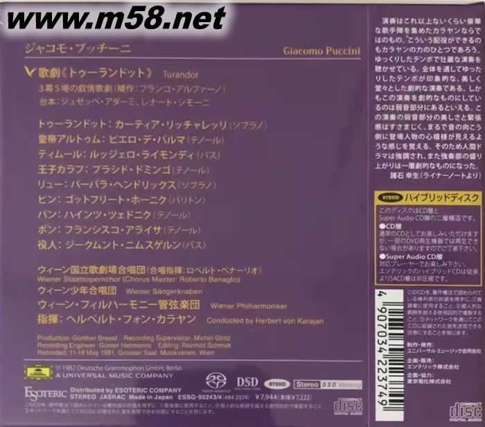Giacomo Puccini : Turandot 普契尼 : 圖蘭朵 (SACD限量版)(m58.net) Genre: Opera Katia Ricciarelli (Turandot) Piero De Palma (Altoum) Ruggero Raimondi (Timur) Plácido Domingo (Calif) Barbara Hendricks (Liu) Conducted by Herbert von Karajan 指揮:卡拉揚 Wiener Staatsopernchor Chorus Master: Roberto Benaglio Wiener Sängerknaben Wiener Philharmoniker 指揮:卡拉揚 ( Herbert von Karajan ) 樂團:維也納交響樂團 (Wiener Philharmoniker ) ESOTERIC專屬代理權(quán) ■ 產(chǎn)品序號:ESSG-90243/44 ( 2片裝 ) ■ 格式:SACD/CD 混合式光碟片 ■ 商標:Deutsche Grammphon ■ DSD信號處理格式/SACD層音效:立體聲 ■ 豪華精裝版包裝 <普契尼:圖蘭朵全劇>卡拉揚指揮維也納愛樂樂團 2SACD。這張唱片眾星云集,聚集了哈恰萊莉、多明戈和亨德里克斯在內(nèi)的強大陣容,并由維也納愛樂樂團伴奏,潛心研究、反復(fù)推敲,最終錄制成這款迄今為止最具中國情調(diào)的《圖蘭多特》。企鵝三星名盤。