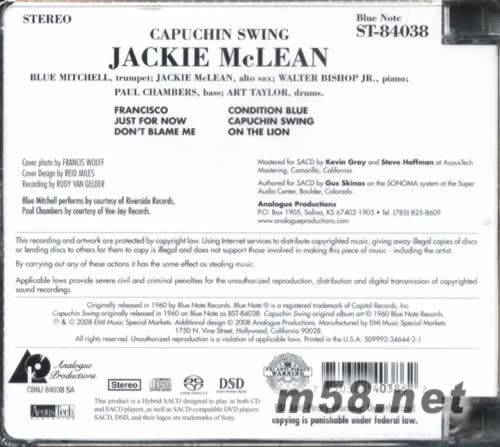 CAPUCHIN SWING 爵士薩克斯大師 SACD(m58.net) Jackie McLean的上半輩子,是一個(gè)高超的的"后帕克比波普"硬核,一個(gè)以鋒利著稱的時(shí)尚嬉皮爵士樂手。他的音樂也是響當(dāng)當(dāng)?shù)挠膊ㄆ铡dh利的刀口完全可以切斷所有其 他樂手的寸斷柔情。反過(guò)頭來(lái),人們又拿著他的作品和那些波普音樂的創(chuàng)始人比試。直到1956年,他加入Mingus的大樂團(tuán)后,真實(shí)的Jackie 才開始慢慢顯露出來(lái)。和Migus在一起的合作,注定是不愉快和短命的。但是沒有那位"暴君"不停的指責(zé)他對(duì)parker大鳥的抄襲,或許Jackie的人生將不會(huì)是我們?cè)谒囊魳分新牭降哪菢印?爪哇猿人的直立行走"(Pithecanthropus Erectus )這張專輯,是第一張后波普爵士專輯,其中的作品每首都是長(zhǎng)篇巨著,令人印象深刻,而且充滿曠野和一種社會(huì)意識(shí)。演奏中充滿不和諧音符和令人眩暈的效果。Jackie的高音薩克斯在布魯斯樂句和尖嘯的高音之間轉(zhuǎn)換和交梭。在和Mingus大叔理所當(dāng)然的對(duì)峙了一段時(shí)間之后,Jackie和貝斯手離開了那個(gè)讓他不舒服,但是打開他藝術(shù)之門的樂隊(duì)。