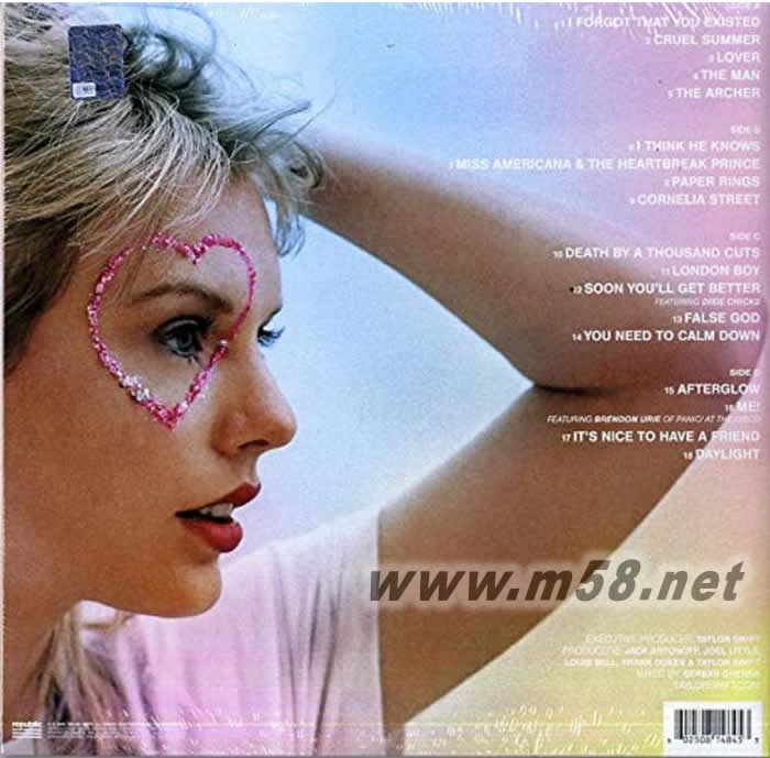 黑膠唱片 1 1. I Forgot That You Existed 2. Cruel Summer 3. Lover 4. The Man 5. The Archer 6. I Think He Knows 7. Miss Americana & The Heartbreak Prince 8. Paper Rings 9. Cornelia Street 10. #VALUE! 黑膠唱片 2 1. Death By A Thousand Cuts 2. London Boy 3. You’ll Get Better 4. False God 5. You Need To Calm Down 6. Afterglow 7. ME! 8. It’s Nice To Have A Friend 9. Daylight
