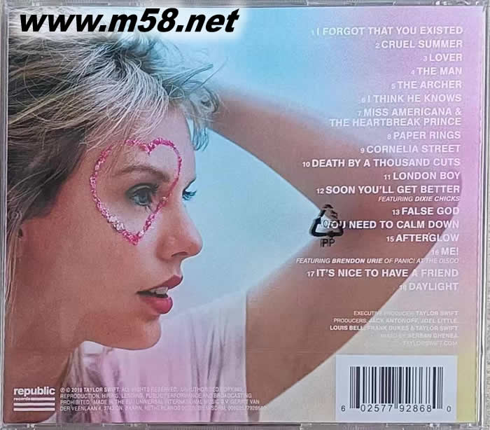1. I Forgot That You Existed 忘記你的存在 2. Cruel Summer 慘痛夏日 3. Lover 情人 登上全臺iTunes冠軍創作曲 4. The Man 男人 5. The Archer 弓箭手 生涯第80首攻入告示牌熱門榜百大暖身曲 6. I Think He Knows 我想他懂我 7. Miss Americana & The Heartbreak Prince 美國小姐與心碎王子 8. Paper Rings 手作紙戒 9. Cornelia Street 科妮莉亞街 10. Death By A Thousand Cuts 凌虐到死 11. London Boy 倫敦男孩 12. Soon You’ll Get Better (feat. Dixie Chicks) 你很快就會好好的 與鄉村女子傳奇團體 狄克西女子合唱團合唱 13. False God 偽神 14. You Need To Calm Down 你需要冷靜一下 橫掃MTV音樂錄影帶大獎入圍「年度歌曲」、「夏日神曲」共9項 15. Afterglow 餘韻 16. ME! YouTube史上最快破億西洋MV 全球突破2億5千萬次串流收聽 17. It’s Nice To Have A Friend 有個好友真好 18. Daylight 曙光