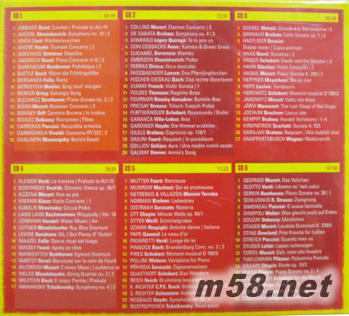 Disc 1: 01 Carmen / Act 3 - Entr'acte The London Symphony Orchestra 2:11 02 Symphony No.10 In E Minor, Op.93 - 2 Allegro Czech Philharmonic Orchestra 3:48 03 2 Etudes De Concert, S.145 - No.1 Waldesrauschen Géza Anda 3:33 04 Trumpet Concerto In E Flat, H.VIIe No.1 - 3 Allegro Maurice André 4:32 05 Czech Dances / Tance II (1879) - 2 Slepicka In B Flat Major (Moderato) Stefan Askenase 2:59 06 Piano Concerto In G - 3 Presto Martha Argerich 3:53 07 Piano Sonata No.8 In C Minor, Op.13 - ''Pathétique'' - 2 Adagio Cantabile Daniel Barenboim 5:21 08 Cantata No.202 ''Weichet Nur, Betrübte Schatten'' (Wedding Cantata), BWV 202 - 5 Aria: Wenn Die Frühlingslüfte Streichen Kathleen Battle 2:39 09 Suite Populaire Espagnole - Nana Narciso Yepes 1:26 10 Lieder Eines Fahrenden Gesellen - Ging Heut' Morgen Übers Feld Thomas Hampson 4:06 11 Peer Gynt, Op.23 - Sung In German - Der Winter Mag Scheiden (Solveig's Song) Erna Berger 2:57 12 Piano Sonata No.2 In A, Op.2 No.2 - 3 Scherzo (Allegretto) Rafal Blechacz 2:58 13 Bassoon Concerto In B Flat, K.191 - 3 Rondo (Tempo Di Menuetto) Dietmar Zeman 4:21 14 Carmina Burana / 3 Cour D'amours - ''In Trutina'' Barbara Bonney 2:28 15 Nocturnes - Orchestral Version - 2 Fêtes The Cleveland Orchestra 6:29 16 Tosca / Act 1 - ''Recondita Armonia'' José Carreras 4:01 17 Concerto In A Minor For 2 Violins, Strings, And Continuo, R.523 - 2 Largo Viktoria Mullova 2:18 18 Boris Godounov - 1869 Version / Act 4 - Proshchay, Moy Syn (Death Of Boris) Feodor Chaliapin 4:44 Disc 2: 01 Clarinet Concerto In A, K.622 - 2 Adagio Michael Collins 7:42 02 Symphony No.4 In E Minor, Op.98 - 3 Allegro Giocoso - Poco Meno Presto - Tempo I Berliner Philharmoniker 5:34 03 Te Lo Juro Yo - Orchestrated By Emilio Aragón Plácido Domingo 2:36 04 Kalinka & Grünes Gras - Arr Serge Jaroff Georg Tymczenko 4:20 05 "West Side Story" - Symphonic Dances - 4 Mambo Simón Bolívar Youth Orchestra of Venezuela 2:16 06 Allegretto (Polka) For String Quartet Emerson String Quartet 2:22 07 Hora Staccato - Arr Jascha Heifetz Christian Ferras 2:17 08 Lieder, Op.62 - ''Herr Pfarrer Hat Zwei Fraeulchen'' Book II No 4 (Poem: Die Pfarrjuengferchen) Brigitte Fassbaender 2:19 09 Cantata ''Christ Lag In Todesbanden'', BWV 4 - 6 Versus 5: ''Hier Ist Das Rechte Osterlamm'' Dietrich Fischer-Dieskau 4:20 10 Sonata For Violin And Piano In A - 1 Allegretto Ben Moderato Augustin Dumay 5:44 11 Ragtime Bass In C Sharp Andor Foldes 1:41 12 The Tale Of Tsar Saltan - Arr J Strimer - The Flight Of The Bumble-Bee Pierre Fournier 1:13 13 Tritsch-Tratsch-Polka, Op.214 - Arr Fr Schimak - Tritsch-Tratsch-Polka, Op.214 - Arr Fr Schimak Radio-Symphonie-Orchester Berlin 2:26 14 Rosamunde, D.797 (Incidental Music To Helmina Von Chézy's Play) - Ballet Music No 2 Berliner Philharmoniker 5:16 15 Bachianas Brasileiras No.5 For Soprano And Cellos - Aria (Cantilena) Elina Garanca 6:17 16 Die Schöpfung Hob XXI:2 / Erster Teil - 14.Chor Und Terzett: ''Die Himmel Erzählen Die Ehre Gottes'' / ''Dem Kommenden Tage Sagt Es Der Tag'' Sylvia McNair 3:46 17 Fantasias (7 Piano Pieces), Op.116 - 7 Capriccio In D Minor Emil Gilels 2:15 18 Requiem, Op.48 - 7 In Paradisum (Chorus) Philharmonia Orchestra 3:49 19 2 Una Madre Comió Asado (A Mother Roasted Her Child) Dawn Upshaw 3:04 20 Annie's Song - Arranged By Charles Gerhardt; Adapted By Craig Leon Sir James Galway 2:57 Disc 3: 01 Sonata À La Marésienne - 5 Très Vivement Musica Antiqua Köln 2:10 02 Sonata For Cello And Piano No.1 In E Minor, Op.38 - 2 Allegretto Quasi Minuetto Truls Mörk 5:26 03 Stabat Mater - 2 Cujus Animam Gementem Ernst Haefliger 6:05 04 Sonatine - 2 Mouvement De Menuet Monique Haas 2:57 05 String Quartet No.14 In D Minor, D.810 - ''Death And The Maiden'' - 3 Scherzo (Allegro Molto) Hagen Quartett 3:30 06 Violin Concerto In D Minor, Op.47 - 3 Allegro, Ma Non Tanto Hilary Hahn 7:15 07 Piano Sonata No.2 In F, K.280 - 2 Adagio Clara Haskil 4:31 08 Le Prophète / Act 3 - Roi Du Ciel Ben Heppner 3:44 09 Tambourin Daniel Hope 1:44 10 6 Moments Musicaux, Op.94 D.780 - No.3 In F Minor (Allegro Moderato) Vladimir Horowitz 2:00 11 Vado, Ma Dove? Oh Dei!, K.583 Gundula Janowitz 4:36 12 La Vierge (1880) / Scene 4: The Assumption - Dernier Sommeil De La Vierge Leo Winland 3:54 13 Locus Iste (Motet) Bavarian Radio Chorus 3:42 14 Variations And Fugue On A Theme By Handel, Op.24 - Variations And Fugue On A Theme By Handel, Op.24 Wilhelm Kempff 3:54 15 Sonatas For Harpsichord (Miscellaneous) - Sonata In F, K.525: Allegro Ralph Kirkpatrick 2:51 16 Ein Deutsches Requiem, Op.45 - 4 Chor: ''Wie Lieblich Sind Deine Wohnungen, Herr Zebaoth!'' Berliner Philharmoniker 5:42 17 Die Walküre / Dritter Aufzug - The Ride Of The Valkyries Berliner Philharmoniker 4:36 Disc 4: 01 La Traviata / Act 3 - Prelude Bavarian State Orchestra 3:39 02 8 Slavonic Dances, Op.46 - For Piano Duet - 7 No.7 In C Minor (Allegro Assai) Alfons Kontarsky 2:45 03 Le Nozze Di Figaro, K.492 / Act 1 - ''Non So Più Cosa Son, Cosa Faccio'' Magdalena Kozená 2:40 04 Concerto For Violin And Orchestra - = 104 - = 120 Gidon Kremer 6:34 05 Circus Polka For A Young Elephant Berliner Philharmoniker 3:21 06 Rhapsody On A Theme Of Paganini, Op.43 - Variation 18 Lang Lang 2:47 07 Water Music Suite No.1 In F, HWV 348 - 15 Air Berliner Philharmoniker 1:09 08 Ruy Blas, Op.95 - Overture To Victor Hugo's Play - Ruy Blas, Op.95 - Overture To Victor Hugo's Play Berliner Philharmoniker 7:42 09 ''Porgy And Bess'' Suite (Catfish Row) - ''Porgy And Bess'' Suite James Levine 1:22 10 El Amor Brujo - Danza Ritual Del Fuego, Para Ahuyentar Los Malos Espí Radio-Symphonie-Orchester Berlin 3:54 11 Après Un Rêve - Arr Pablo Casals For Cello And Piano Mischa Maisky 3:20 12 Music To Goethe's Tragedy ''Egmont'' Op.84 Orchestre des Concerts Lamoureux 9:10 13 Berceuse Sur Le Nom De Gabriel Fauré Jean Antonietti 2:36 14 Mass In C Minor, K.427 ''Grosse Messe'' - Edited Maunder / Gloria - Laudamus Te Sarah Connolly 4:42 15 String Quartet In D, Op.44, No.1 - 2 Menuet
