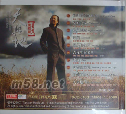天與地24K金碟日本版(m58.net) 中西全壁的百人大音樂隊加上多聲部合唱與童聲,在著名青年藝術(shù)指揮家范熹先生的監(jiān)制下,中西精英樂師全線匯聚中央由視臺480平方米錄音棚.來自草原上最純樸的聲音--騰格爾"天與地"無專輯,經(jīng)周密細致的準備工作,以傳統(tǒng)模擬錄音的大制作一鼓定音,一次性順利完成. 外表溫文爾雅,內(nèi)心充滿激情的騰格爾,就像蒙古草原上的烈馬奔放,高吭嘹亮的喉音帶著自然,飽蘊的泥土味時而像高原的疾風呼嘯,時而像長河靜靜的細流,帶著深深的情,唱也出人間的真善美,唱遍了黃土地每個角落的故事. 騰格爾是個有根有生命力的歌者,他身后有廣大的蒙古民族,有廣袤的蒙古草原,有深厚的游牧文化的淵源,這決定了他的音樂文化品位的尊貴. 歷時兩年,精心創(chuàng)作的全新音樂作品,具有強烈的感染力,將積蓄已久的情感受發(fā)揮的淋流漓盡致,是深情,是孤獨,是歡樂,是苦難,是希望,是愛情,這些抒情的旋律充滿了濃濃的情誼,美妙,甜美,安色,使人置身于迤邐的大草原而陶醉其中,不愿離去. 雄鷹圪立在天地之間,唱出了人間真善美,唱出心中永恒的信念,唱出對黃土地的眷戀和熱愛,唱出愛的偉大,把自己緊緊地各草原系在一起,愿自己的一生獻給熱愛生活,熱愛音樂的人們.