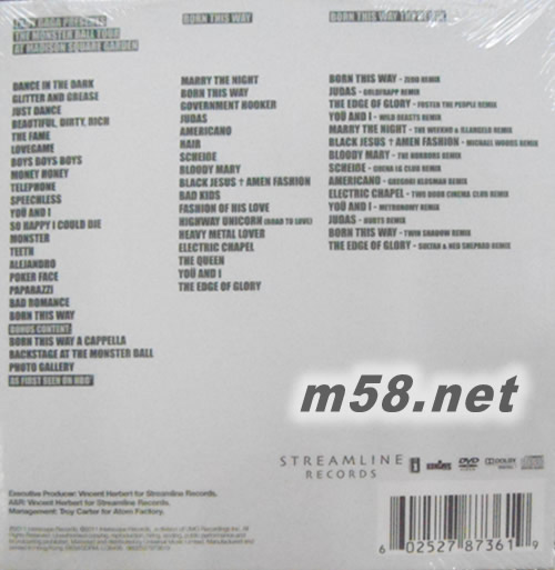 DISK 1 DVD 1. Dance In The Dark 在黑暗中漫舞 2. Glitter And Grease 閃亮與油膏 3. Just Dance 舞力全開 4. Beautiful, Dirty, Rich美麗 骯臟 富有 5. The Fame 超人氣 6. LoveGame 愛情游戲 7. Boys Boys Boys 男孩 男孩 男孩 8. Money Honey 金錢寶貝 9. Telephone 電話 10. Speechless 無言以對 11. Yoü And I 你和我 12. So Happy I Could Die 死無遺憾 13. Monster 怪獸 14. Teeth 張牙舞爪 15. Alejandro 亞歷山卓 16. Poker Face 撲克臉 17. Paparazzi 愛情狗仔 18. Bad Romance 羅曼死 19. Born This Way 天生完美 20. Bonus Content: Born This Way A Cappella天生完美 清唱版 21. Backstage At The Monster Ball幕后花絮 22. Photo Gallery相片集 DISK 2 CD 1. Marry The Night 夜的嫁衣 2. Born This Way 天生完美 3. Government Hooker 娼妓政治學 4. Judas 猶大 5. Americano 美國夢 6. Hair 自由髮則 7. Scheiße 狗屎事 8. Bloody Mary 血腥瑪莉 9. Black Jesus + Amen Fashion 黑色耶穌+讚頌時尚 10. Bad Kids 壞胚子 11. Fashion Of His Love 愛的定義 12. Highway Unicorn (Road To Love) 獨角獸 13. Heavy Metal Lover 重金搖滾情人夢 14. Electric Chapel 電音圣殿 15. The Queen 我是女王 16. Yoü And I 你和我 17. The Edge Of Glory 榮耀極限 DISK 3 CD 1. Born This Way – 天生完美Zedd Remix 2. Judas – 猶大Goldfrapp Remix 3. The Edge Of Glory – 榮耀極限Foster The People Remix 4. Yoü And I – 你和我Wild Beasts Remix 5. Marry The Night – 夜的嫁衣The Weeknd & Illangelo Remix 6. Black Jesus † Amen Fashion – 黑色耶穌+讚頌時尚Michael Woods Remix 7. Bloody Mary – 血腥瑪莉The Horrors Remix 8. Scheiße – 狗屎事Guena Lg Club Remix 9. Americano – 美國夢Gregori Klosman Remix 10. Electric Chapel – 電音圣殿Two Door Cinema Club Remix 11. Yoü And I – 你和我Metronomy Remix 12. Judas – 猶大Hurts Remix 13. Born This Way – 天生完美Twin Shadow Remix 14. The Edge Of Glory – 榮耀極限Sultan & Ned Shepard Remix