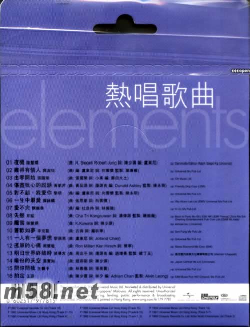 熱唱歌曲(m58.net) 【Elements】-系列 得獎金曲..合唱 電影 勵志 小調 跳舞 混音 國語 現場 樂隊 改編..歌曲 蒐集15種中文歌曲元素, 并湊環球經典絢麗音樂原色! 簡約輕便包裝 超值限量發行