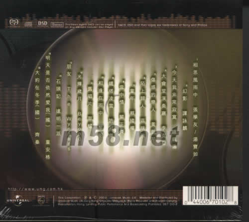 極品之選監聽版1(群星)SACD(m58.net) 0670102[極品之選(1)發燒男聲SACD版]一些大鍋飯式的精選集,對一般消費者是具有吸引力,但對執著的發燒友是引不起興趣的.除非他一些國際性LABLE如FIM\喇叭花。但這張《SACD極品之選發燒男聲》卻是經過<環球>嚴格處理而成,選曲全是八、九0年代的冠軍曲。