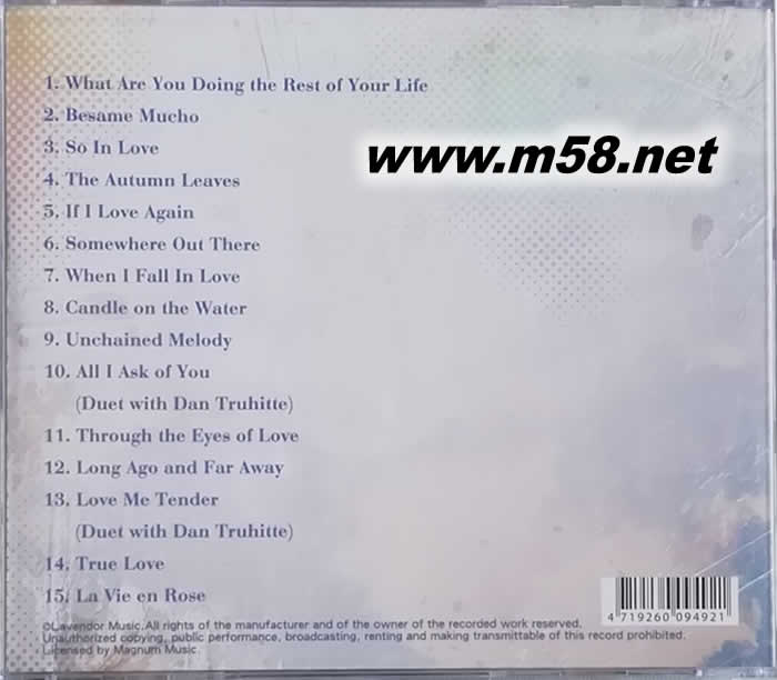 1. What Are You Doing the Rest of Your Life 2. Besame Mucho 3. So In Love 4. The Autumn Leaves 5. If I Love Again 6. Somewhere Out There 7. When I Fall In Love 9 8. Candle on the Water 9. Unchained Melody 10. All I Ask of You (Duet with Dan Truhitte) 11. Through the Eyes of Love 12. Long Ago and Far Away 13. Love Me Tender (Duet with Dan Truhitte) 14. True Love 15 LA VIE EN ROSE