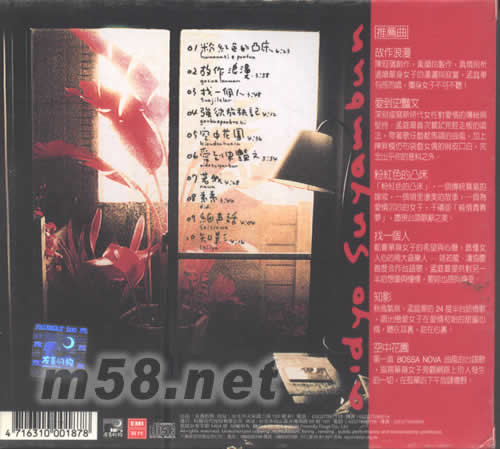 價格為估,以實到貨為準! 愛到史艷文(m58.net) 請點看產品正、背面大圖 一向唱國語歌的孟庭葦,終于有機會證明她的閩南語功力,全新臺語專輯《愛到史艷文》10月正式發行。為了這張臺語專輯,孟庭葦煞費苦心,光是收歌就等了兩年之久。二年沒出片的她,此次邀請到陳升擔任制作人,創作者包括:黃韻玲、陳冠蒨、鄭華娟、潘協慶等。寫慣了國語歌的他們譜出的臺語歌曲依然婉約動聽,孟庭葦也一改往日的輕柔甜美,以清新俏皮的方式演繹。