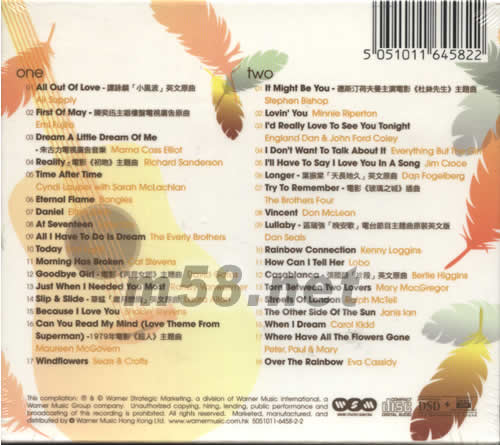 ONE 1.ALL OUT OF LOVE譚詠麟[小風波]英文原曲 AIT SUPPLY 2.FIRST OF MAY陳奕迅主唱樓盤電視廣告原曲 EML FUJITA 3.DREAM A LITTLE DREAM OF ME 朱古力電神廣告音樂MAMA CASS ELLOT 4.REALITY--電影(初吻)主題曲RICHARD SANDERSON 5.TIME AFTER TIME CYNDI LAUPER WITH SARAH MCLACHLAN 6.ETENAL FLAME-- BANGLES 7.DANILE --EITON JONN 8.AT SEVENTEEN--JONIS LAN 9.ALL L HAVE TO DO IS DREAM- THE EVERLY BROTHERS 10.TODAY -EMI FUJITO 11.MORNING HAS BROKEN --CAT STEVENS 12.GOODBYE GIRL--電影(再見女郎)主題曲DAVID GATES 13.JUST WHEN I NEEDED YOU MOST --RANDY VANWARMER 14.SLIP & SLIDE --草蜢[歲月燃燒]英文原曲LAURA ALLAN 15.BECAUSE I LOVE YOU --SHAKIN 'STEVENS 16.CAN YOU READ MY MIND (LOVE THEME FROM SUPERMAN)-1979年電影(超人)主題曲 MAUREEN MCGOVERN 17.WINDFLOWERS --SEAIS & CROFTS TWO 1.IT MIGHT BE YOU --德斯汀荷夫電主演電影(杜絲先生)主題曲STEPHEN BISHOP 2.LOVIN'YOU --MINNIE RIPERTON 3.I'd REALLY LOVE YOU TONIGHT --ENGLAND DAN &JOHN FORD COLEY 4.I DON'T WANT TO TALT ABOUT IT --EVERYTHING BUT THE GIRL 5.I'LL HABE TO SAY LOVE YOU IN SONG --JIM CROCE 6.LONGER-葉振棠[天長地久]英文原曲 DAN FOGELBERG 7.TRY TO REMEMBER-電影<玻璃之城>插曲 THE BTOTHER FOUR 8.VINCENT --DAN MCLEAN 9.LULLABY --區瑞強<晚安歌>電臺節目主題曲原裝英文版 DAN SEALS 10.RAINBOW CONNECTION --KENNY LOGGINS 11.HOW CAN I TELL HER --LOBO 12.CASABLANCA-張國榮<片段>英文原曲ERTIE HIGGINS 13.TORN BETWEEN TWO LOVERS --MARY MACGREGAR 14.STEETS OF LONDON --RALPH MCTIELL 15.THE OTHER SIDE OF THE SUN--JANIS LAN 16.WHEN I DREAM --CAROL KIDD 17.WHERE HAVE ALL THE FLOWERS GONE --PETER PAUL &MARY 18.OVER THE RAINBOE --EVA CASSIDY