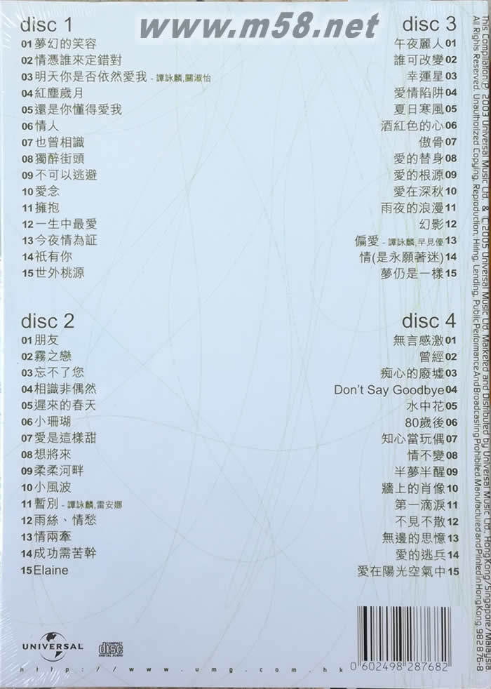 Disc 1 01. 夢幻的笑容 02. 情慿誰來定錯對 03. 明天你是否依然愛我 (譚詠麟,關淑怡) 04. 紅塵歲月 05. 還是你懂得愛我 06. 情人 07. 也曾相識 08. 獨醉街頭 09. 不可以逃避 10. 愛念 11. 擁抱 12. 一生中最愛 13. 今夜情為証 14. 袛有你 15. 世外桃源 Disc 2 01. 朋友 02. 霧之戀 03. 忘不了你 04. 相識非偶然 05. 遲來的春天 06. 小珊瑚 07. 愛是這樣甜 08. 想將來 09. 柔柔河畔 10. 小風波 11. 暫別 12. 雨絲、情愁 13. 情兩牽 14. 成功需苦干 15. Elaine Disc 3 01. 午夜麗人 02. 誰可改變 03. 幸運星 04. 愛情陷阱 05. 夏日寒風 06. 酒紅色的心 07. 傲骨 08. 愛的替身 09. 愛的根源 10. 愛在深秋 11. 雨夜的浪漫 12. 幻影 13. 偏愛 (譚詠麟,早見優) 14. 情 (是永遠著迷) 15. 夢仍是一様 Disc 4 01. 無言感激 02. 曾經 03. 癡心的廢墟 04. Don't Say Goodbye 05. 水中花 06. 80歲后 07. 知心當玩偶 08. 情不變 09. 半夢半醒 10. 墻上的肖像 11. 第一滴涙 12. 不見不散 13. 無邊的思憶 14. 愛的逃兵 15. 愛在陽光空氣中