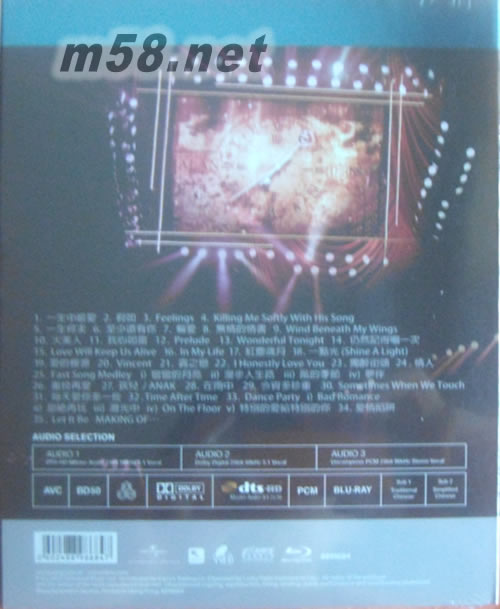 01. 一生中最愛 02. 假如 03. Feelings 04. Killing Me Softly With His Song 05. 一生何求 06. 至少還有你 07. 偏愛 08. 無情的情書 09. Wind Beneath My Wings 10. 火美人 11. 我心如雷 12. Prelude 13. Wonderful Tonight 14. 仍然記得嗰一次 15. Love Will Keep Us Alive 16. In My Life 17. 紅塵歲月 18. 一點(diǎn)光 (Shine A Light) 19. 愛的根源 20. Vincent 21. 霧之戀 22. I Honestly Love You 23. 獨(dú)醉街頭 24. 情人 25. Fast Song Medley i) 彎彎的月亮 ii) 漫步人生路 iii) 風(fēng)的季節(jié) iv) 夢伴 26. 重投再愛 27. 孩兒 / ANAK 28. 在雨中 29. 今宵多珍重 30. Sometimes When We Touch 31. 每天愛你多一些 32. Time After Time 33. Dance Party i) Bad Romance ii) 拒絕再玩 iii) 激光中 iv) On The Floor v) 特別的愛給特別的你 34. 愛情陷阱 35. Let It Be 36. Making of