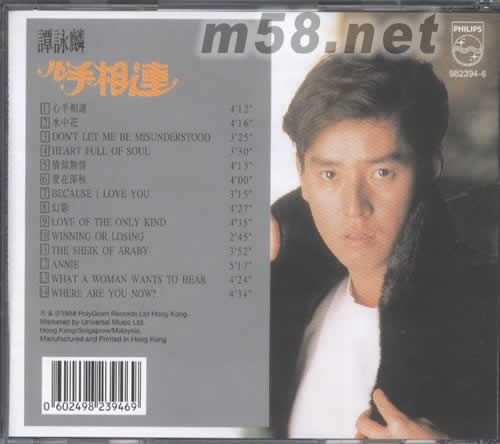 1、心手相連/88年漢城奧運會會歌(國) 2、水中花 3、DON‘T LET E BE MISUNDERSTOOD 4、HEART FULL OF SOUL 5、情似無情 6、愛在深秋 7、BECAUSE I LOVE YOU 8、幻影 9、LOVE OF THE ONLY KIND 10、WINNING OR LOSING 11、THE SHEIK OF ARABY 12、ANNIE 13、WHAT A WOMAN WANTS TO HEAR 14、WHERE ARE YOU NOW?