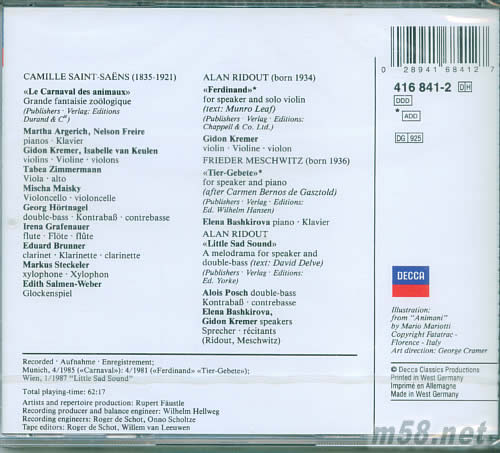 Camille Saint-Saens (1835 - 1921) Le Carnaval des Animaux Introduction et Marche royale du Lion [2:21] Poules et Coqs [0:42] Hémiones (Animaux véloces) [0:33] Tortues [2:56] L'Elephant [1:34] Kangourous [1:04] Aquarium [2:34] Personnages à longues oreilles [0:50] Le coucou au fond des bois [2:17] Volières [1:14] Pianistes [1:26] Fossiles [1:16] Martha Argerich, Georg Maximilian Hortnagel, Nelson Freire, Gidon Kremer, Isabelle van Keulen, Tabea Zimmerman, Mischa Maisky, Irena Grafenauer, Eduard Brunner, Markus Steckeler, Edith Salmen-Weber Le Cygne [3:10] Martha Argerich, Mischa Maisky, Nelson Freire Finale [1:48] Martha Argerich, Georg Maximilian Hortnagel, Nelson Freire, Gidon Kremer, Isabelle van Keulen, Tabea Zimmerman, Mischa Maisky, Irena Grafenauer, Eduard Brunner, Markus Steckeler, Edith Salmen-Weber Alan Ridout (1934 - ) Ferdinand, for Speaker and Solo Violin [10:41] Elena Bashkirova, Gidon Kremer Frieder Meschwitz (1936 - 1983) Tier-Gebete, for Speaker and Piano 1. Gebet des Ochsen [1:59] Gidon Kremer, Elena Bashkirova 2. Gebet der Maus [0:29] 3. Gebet der Katze [1:27] Elena Bashkirova 4. Gebet des Hundes [1:30] Gidon Kremer, Elena Bashkirova 5. Gebet der Ameise [1:13] Elena Bashkirova 6. Gebet der Elefanten [2:11] Gidon Kremer, Elena Bashkirova 7. Gebet der Schildkrote [1:29] Elena Bashkirova 8. Gebet der Giraffe [1:13] Gidon Kremer, Elena Bashkirova 9. Gebet des Affen [0:48] Elena Bashkirova 10. Gebet des Hahnes [0:32] 11. Gebet des alten Gaules [2:20] Gidon Kremer, Elena Bashkirova 12. Gebet des Schmetterlings [1:09] Elena Bashkirova Alan Ridout (1934 - ) Little Sad Sound, a Melodrama for Speaker and Double-bass [11:32] Gidon Kremer, Alois Posch