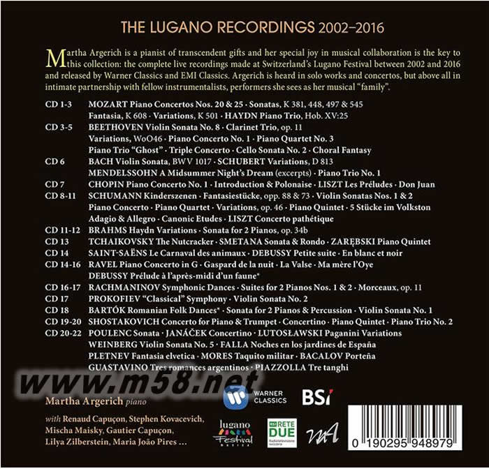 The Lugano Recordings 阿格麗希之盧加諾音樂節2002-2016錄音全集 22CD大套裝(m58.net) 阿格麗希無疑是當前活躍於國際樂壇的女性鋼琴家里,最具有女王氣質的一位。她被英國《留聲機》形容為「無疑是有史以來最偉大的鋼琴家之一,以如液體火焰般的鋼琴演奏精技,以及具有獨特豐富想像力的活力聞名」。她的音樂生涯也屬於「非傳統路線」:得到日內瓦國際鋼琴大賽首獎,國際事業也開始起飛之際,她卻在1960年選擇退隱,直到1965年贏得華沙蕭邦國際鋼琴大賽首獎才又回到國際樂壇。而且演出曲目雖然廣泛,但是阿格麗希卻更偏愛協奏曲與室內樂。 從2002年到2016年,阿格麗希每年六月都在瑞士盧加諾舉行音樂節。依照阿格麗希的構思,這個音樂節不只邀請已經在世界樂壇佔有一席之地的音樂家,還有她所賞識的新秀,以及具有豐富教學經驗的前輩,大家齊聚在盧加諾,密集舉辦多場獨奏會、室內樂,或是與瑞士義語區廣播管弦樂團合作交響音樂會,透過各種組合的室內樂合作,年輕一代的音樂家不只有機會有與前輩切磋,每一年的音樂節也發掘出不少罕為人知的有趣室內樂曲目。 這一套專輯收錄了阿格麗希十四年來在盧加諾音樂節中的所有演出錄音,曲目包括一些鋼琴獨奏曲、大量的鋼琴二重奏,以及室內樂、協奏曲;曲目則跨越十八到二十世紀。