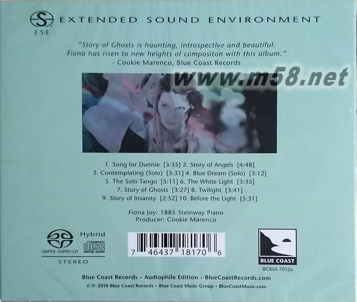幽靈的故事 Story of Ghosts 菲奧娜 鋼琴專輯 SACD(藍岸唱片)(m58.net) 藍岸唱片(Blue Coast Records) 旗下最新推出,澳洲籍鋼琴家Fiona Joy (菲奧娜) 第三張作品幽靈的故事(Story of Ghosts)。是一位熟練的鋼琴家,演奏1885年施坦威(1885 Steinway)鋼琴,憑藉這專輯,她已昇華到另一新景象,鋼琴技巧真正展現出來,音樂構圖美麗動人,歌曲令人感到舒適,使人放鬆和內省。忙碌生活下,正正需要這樣輕鬆的音樂,絕對可以享受重播數小時。Hybrid Stereo SACD (Super Audio CD) │ Plays on All SACD and CD Players.