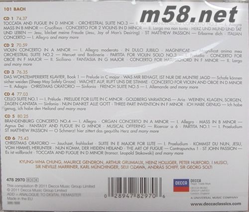 101 BACH 101 巴赫殿堂大師精選套裝 101古典系列6CD套裝(m58.net) 2012全新101最愛系列 古典名廠牌DECCA超值6CD必備曲目,殿堂大師演繹 DECCA唱片官方試聽網址(片段): http://www.deccaclassics.com/cat/single?sort=newest_rec&PRODUCT_NR=4782970&SearchString=101&per_page=50&flow_per_page=50&presentation=flow&UNBUYABLE=1