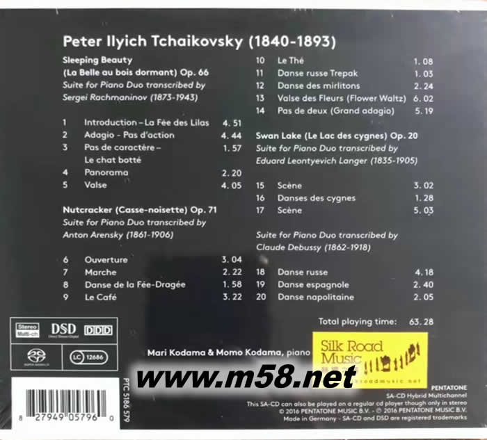 柴科夫斯基 芭蕾組曲(改編給雙鋼琴演奏Tchaikovsky: Ballet Suites transcribed for Piano Duo SACD(m58.net) Mari Kodama (piano)、Momo Kodama (piano) 兒玉麻里/兒玉桃鋼琴(SACD),包括:睡美人/胡桃夾子組曲,專輯是國際上知名的日本鋼琴姐妹花首度合作,以流暢的演奏、飽滿的音色、默契的配合創(chuàng)造出一個(gè)美樂專輯。德國壓制 1. 國際知名的日本鋼琴姊妹花兒玉麻里(Mari Kodama)和兒玉桃(Momo Kodama)活躍於古典樂壇多年,但都是以各自獨(dú)立奮斗為主線發(fā)展,這專輯是她倆首度合作的錄音出版,難得和珍貴。 2. 柴科夫斯基的傳世芭蕾舞曲原是以管弦樂形式演繹而為樂迷認(rèn)識(shí)和接受,這專輯特別挑選由阿連斯基(Anton Arensky)改編的[胡桃夾子(Nutcracker)],拉赫曼尼諾夫(Sergey Rachmaninov)和德彪西(Claude Debussy)分別改編的[睡美人(Sleeping Beauty)]和[天鵝湖(Swan Lake)]的雙鋼琴演奏版本,因改編者有著不同的性格和對(duì)這些永恆經(jīng)典的理解,鋼琴演奏予人有一種新鮮,特別和更親切的感覺。 3. 兒玉姊妹的演奏順滑流暢,起伏明確鏗鏘,音色抒情亮澤,加上接近無瑕的默契,創(chuàng)造出一個(gè)美樂專輯。