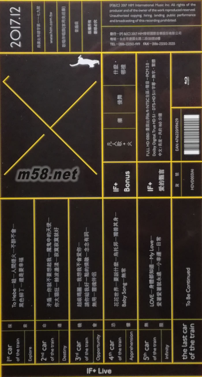 IF ONLY 如果 田馥甄巡迴演唱會 PLUSL IVE BD 長條豪華版(m58.net) 2016如果plus列車最美風景 2017如果plus紀實未完繼續! Live → 34首完整曲目 精彩收錄 Video → 比爾賈執導全新短片影像 人生車廂創造無限 Love → 田馥甄愛的小宇宙 真心真意「愛的甄言」 Design → 聶永真操刀設計BD/DVD雙版本 封面透視演唱會服裝視覺細節