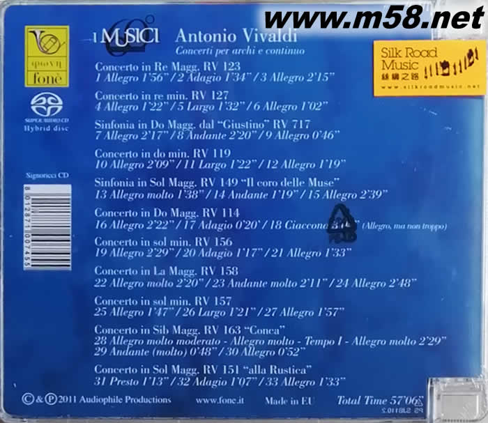 意大利音樂(lè)家合奏團(tuán)(I Musici) 60周年紀(jì)念專輯 :維瓦爾第給弦樂(lè)及通奏低音的協(xié)奏曲 SACD(m58.net) <意大利音樂(lè)家合奏團(tuán)(I Musici)>於1952年在羅馬成立,成員包括6位小提琴手、2位中提琴、2位大提琴、1位低音大提琴和1位琴鍵手,以演奏意大利巴洛克時(shí)代的作品最為擅長(zhǎng),其[維瓦爾第"四季"(Vivaldi"Four Seasons")]之唱片全球總銷量超越1千萬(wàn),蜚聲國(guó)際,極受歡迎,更被譽(yù)為史上最權(quán)威的詮釋,並掀起二十世紀(jì)風(fēng)起云涌的韋瓦爾第復(fù)興運(yùn)動(dòng),其影響力 之大,可想而知。過(guò)往50多年其間,樂(lè)團(tuán)獲獎(jiǎng)多不勝數(shù),包括國(guó)際唱片大獎(jiǎng)(Grand Prix International du Disc)、艾德森獎(jiǎng)(Edison Award)及德國(guó)唱片業(yè)大獎(jiǎng)(Deutsche Schallplattenpreis)等,其國(guó)際樂(lè)壇地位,備受認(rèn)同。 為慶祝<意大利音樂(lè)家合奏團(tuán)>於2012年成立60週年的大日子,於2011-2012年樂(lè)季開始為期一年的全球巡迴演出,並推出60週年的紀(jì)念專輯,再次帶來(lái)他們最鐘愛(ài)的維瓦爾第多首[給弦樂(lè)及通奏低音的協(xié)奏曲(Concerti per archi e continuo)],分別以全球限量496張的24K金碟、SACD與及里奇最新研制的錄音科技「Signoricci CD」制式推出,給予樂(lè)迷更豐富的選擇,專業(yè)調(diào)製后現(xiàn)場(chǎng)感節(jié)節(jié)提升,令音樂(lè)愛(ài)好者更能體驗(yàn)音樂(lè)的真諦及威力。