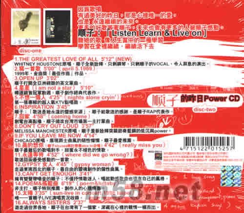 CD1 1、THE GREATEST LOVE OF ALL 2、寫一首歌 3、OPEN UP 4、星星 5、不想一個人 6、INSPIRATION 7、回家 CD 2 8、DON‘T CRY OUT LOUD 9、IF YOU LEAVE ME NOW 10、真的想你 11、永遠等你 12、GYPSY女人 13、CANT GET ENOUGH 14、POEM 搖籃曲 15、太陽 16、ALWAYS SISTERS