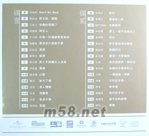 Disc 1 01. Hurt So Bad - 張敬軒 02. 對不起,謝謝 - 陳奕迅 03. 我真的受傷了 - 王菀之 04. 陌生人 - 蔡健雅 05. 在每一秒里都想見到你 - 王力宏 06. 原來你什麼都不要 - 張惠妹 07. 淚海 - 許茹蕓 08. 值得 - 鄭秀文 09. 男人不該讓女人流淚 - 蘇永康 10. 傷痕 - 林憶蓮 11. 心痛 - 陳潔儀 12. 新不了情 - 萬芳 13. 浪人情歌 - 伍佰 14. 我愿意 - 王菲 15. 執(zhí)迷不悔 - 王菲 16. 祝福 - 張學(xué)友 Disc 2 01. 吻別 - 張學(xué)友 02. 瀟灑走一回 - 葉倩文 03. 光輝歲月 - BEYOND 04. 愛上一個(gè)不回家的人 - 林憶蓮 05. 哭砂 - 黃鶯鶯 06. 你怎麼舍得我難過 - 黃品源 07. 夢醒時(shí)分 - 陳淑樺 08. 讓我一次愛個(gè)夠 - 庾澄慶 09. 是否我真的一無所有 - 王杰 10. 其實(shí)你不懂我的心 - 童安格 11. 一場游戲一場夢 - 王杰 12. 大約在冬季 - 齊秦 13. 夜來香 - 蔡琴 14. 我只在乎你 - 鄧麗君 15. 留不住的故事 - 黃鶯鶯 16. 奉獻(xiàn) - 蘇芮