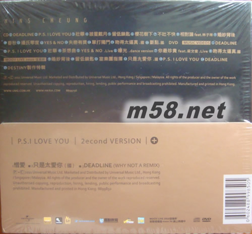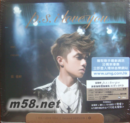 P.S. I Love You 新歌加精選 (第二版)(m58.net) 張敬軒第二張新曲加精選大碟,《P.S. I Love You》收錄了三首新曲,并從2008年《Urban Emotions》、《Love & Living》至第11張大碟《No. Eleven》的嚴選了13首精選歌。張敬軒以生離死別為主題,分別為第一主打歌「Deadline」、點題之作「P.S. I Love You」和「壯舉」作曲,并與嚴勵行聯手擔當監制。在制作此專輯的期間,去年軒仔因患肺炎影響錄音工作而一再延期,終于2011年4月發行。 隨碟特別附上DVD,內有∶ 八首歌曲MV∶有「P.S. I Love You」新歌MV、「曝光」Dance version,以及「Yes & No」和「你最珍貴」(feat.梁文音)現場版 2010年9月6日在香港兆基創意書院多媒體劇場舉行的《MOOV Live 2010》∶收錄了六首張敬軒現場演繹歌曲和《DESTINY》制作特輯 第二版特別附上《戀LOVELOVE》殘酷愛情劇場Part 2片尾曲「惜愛」(細蘇作曲、火火填詞)、國語新歌「只是太愛你」和「Deadline」Why not a remix版本CD、
