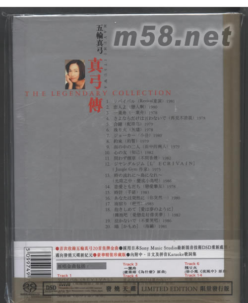 價(jià)格為估,以實(shí)到貨為準(zhǔn)! 真弓傳SACD(限量發(fā)行版)(m58.net) SACD 1+1限量版 1支SACD碟只能在SACD機(jī)播放 送:1支最靚聲的DSD、CD,可在會(huì)可CD機(jī)播放 五輪真弓首張全紀(jì)錄超級(jí)精選,一次過擁有20首最值得回味的舊愛經(jīng)曲。 LIMITED EDITION限量發(fā)行版 首次收錄五輪真弓20首皇牌金曲 采用日本SONY MUSIC STUDIO最新混音技術(shù)DSD重新處理,邁向發(fā)燒天碟新紀(jì)元 豪華精裝珍藏版 內(nèi)附中、日文及拼音KARAOKE歌詞集
