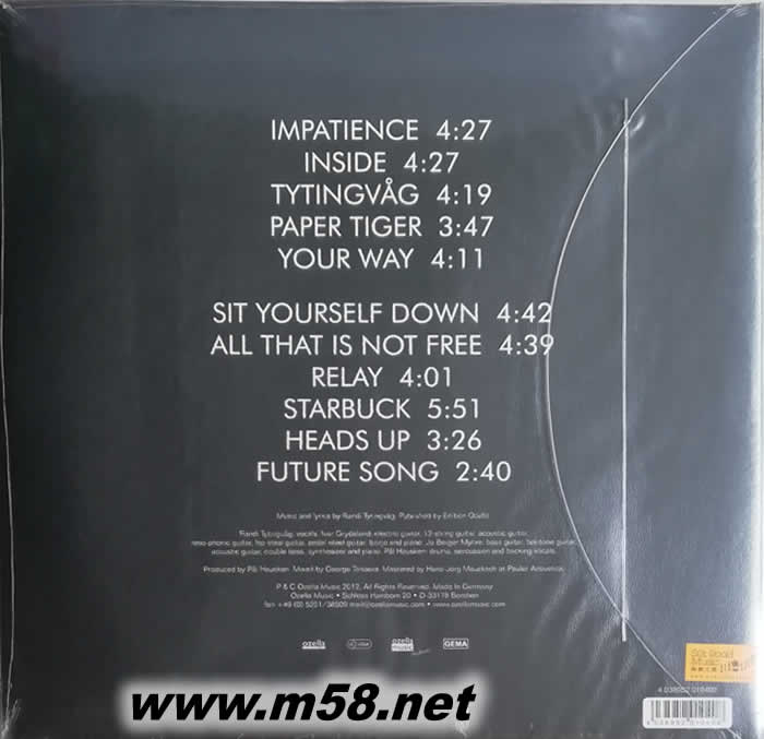 【Impatience (不耐煩)】、【Inside (內(nèi)裹)】、【 Tytingvåg (蒂廷瓦格)】、【Paper Tiger (紙老虎)】、【Your Way (你的方式)】、【Sit Yourself Down (自己坐下來)】、【All That Is Not Free (所有那些不是免費的)】、【Relay (繼接)】、【Starbuck (星巴克)】及【Heads Up (提醒)】等