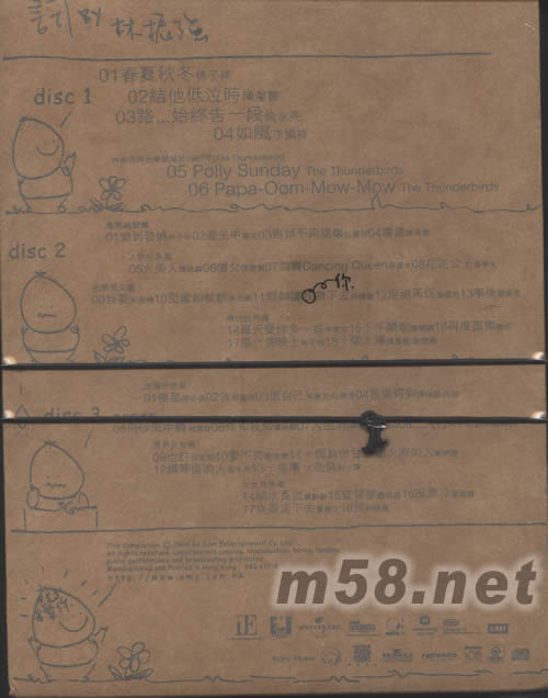 DISC 1 01. 春夏秋冬 -林子祥 02. 結(jié)他低泣時 -陳潔靈 03. 路...始終告一段 -倫永亮 04. 如風(fēng) -李國祥 林振強與音樂結(jié)緣于1967年[The Thunderbirds] 05. Polly Sunday -The Thunderbirds 06. Papa-Oom-Mow-Mow -The Thunderbirds DISC 2 鬼馬幽默篇 01. 愛到發(fā)燒 -林子祥 02. 激光中 -羅文 03. 眉頭不再猛皺 -杜麗莎 04. 震蕩 -陳秀雯 人物形象篇 05. 火美人 -譚詠麟 06. 傻女 -陳慧嫻 07. 勁舞 Dancing Queen -麥潔文 08. 花花公子 -張學(xué)友 色情男女篇 09. 我要 -葉德嫻 10. 甜蜜如軟糖 -陳秀雯 11. 假如讓我吻下去 -林憶蓮 12. 拒絕再玩 -張國榮 13. 事后 -劉美君 傳世經(jīng)典篇 14. 每天愛你多一些 -張學(xué)友 15. 千千闕歌 -陳慧嫻 16. 再度孤獨 -甄妮 17. 每一個晚上 -林子祥 18. 千個太陽 -陳潔靈/葉德嫻 DISC 3 自強不息篇 01. 摘星 -陳百強 02. 強 -郭富城 03. 信自己 -葉倩文/杜德偉 04. 我做得到 -譚詠麟/成龍 真我性情篇 05. 飛砂風(fēng)中轉(zhuǎn) -周潤發(fā) 06. 你知我知 -譚詠麟 07. 人生酒庫 -Blue Jeans 08. 三人行 -林子祥/劉天蘭/詩詩 男男女女篇 09. 也許 -何家勁 10. 愛不完 -劉德華 11. 一個為你甘去蹈火海的人 -鄭伊健 12. 鋼琴后的人 -倫永亮 13. 一些事一些情 -郭小霖 女女男男篇 14. 細(xì)水長流 -蔡齡齡 15. 豆芽夢 -露云娜 16. 風(fēng)是冷 -陳潔靈 17. 我要活下去 -葉倩文 18. 哭 -林憶蓮