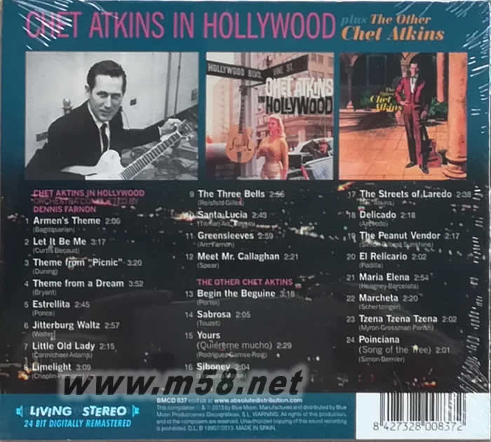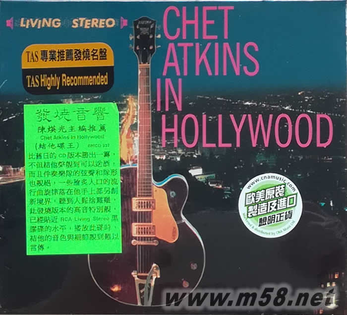 IN HOLLYWOOD PLUS THE OTHER CHET ATKINS 在好萊塢 吉它 (發燒音響推介)(m58.net) Chet Atkins in Hollywood及The Other Chet Atkins兩張TAS上榜天碟,無論在選曲、錄音或演奏,均是完美,共24首歌曲,沒有刪剪,二合為一。殿堂級結他手,音樂風格更深深地影響了后世?結他手,曾推出約七十多張個人作品,總銷售量超越七千五百萬張,共獲取十四座格萊美獎,更是鄉村音樂名人堂的藝人。In Hollywood 是1959年作品,當年只用了小量樂器錄音,但Chet Atkins表現出個人的指法和技巧,使音樂豐富多變,名曲多首包括Let It Be Me、Greensleeves、Santa Lucia等等,最佳的民謠原曲爵士化之示范。The Other Chet Atkins名副其實是一張使人眼前一亮,展現出他的另一面作品,不演奏其首本鄉村音樂,是一張百分百的西班牙結他專輯,1960年推出,柔情的Chet Atkins與溫暖的Gibson結他。