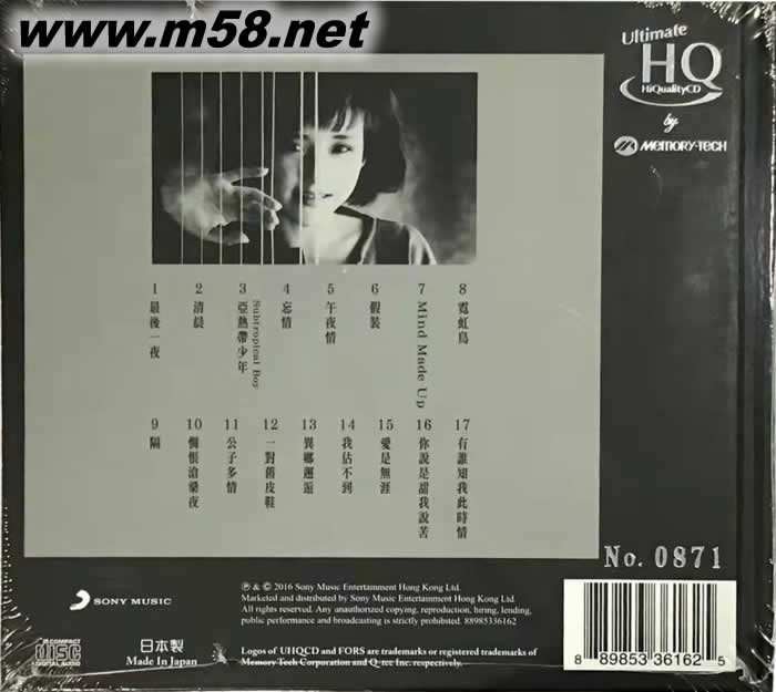 劉美君最后一夜同名經典發燒盤 UHQCD 限量版(m58.net) 首批1,000張均付獨立編號 于HQCD誕生6年后,日本MEMORY TECH成功應用新材質和開發嶄新制碟技術,研發出最新高品質CD-ULTIMATE HQCD(UHQCD).UHQCD完全顛覆傳統CD制程,印制出精確“數據坑”,還原出最接近母帶的音質,音效直逼玻璃CD,全程日本制造。