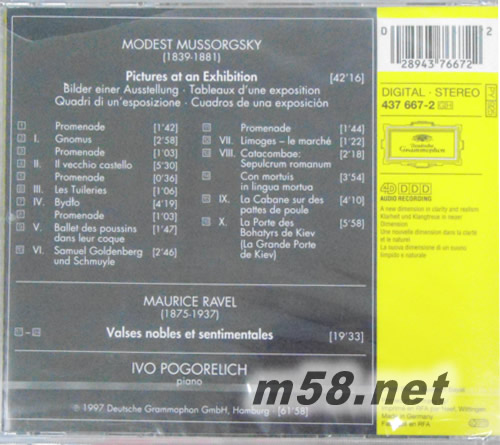 穆索斯基:展覽會之畫(鋼琴版)&拉威爾:高雅而憂傷的圓舞曲Mussorgsky:Pictures At An Exhibition &Ravel:Valses Nobles Et(m58.net) 穆索斯基:展覽會之畫 ; 拉威爾:高貴與憂傷的圓舞曲 / 波哥雷里奇 (鋼琴) Mussorgsky: Pictures at an Exhibition ; Ravel: Valses nobles et sentimentales / Ivo Pogorelich 作曲家:穆索斯基 演出者:波哥雷里奇