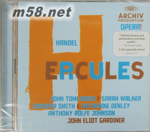 神劇《赫丘力士》是韓德爾1720年的作品,故事就是描寫這個希臘神話中的大力士與狄亞妮拉公主之間的故事,賈第納出色的以古樂器表現出韓德爾作品里的活力與自然的戲劇效果。約翰‧湯姆林森演唱的「赫丘力士」是一個深沉的絕佳典范;而莎拉‧沃克飾演的「狄亞妮拉公主」,可說是全劇最具熱情的演出。精致的演奏再加上出色的錄音,讓整體效果相當迷人。