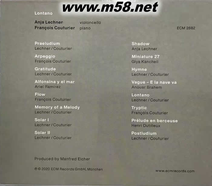 遠方Lontano 大提琴與鋼琴二重奏(m58.net) Anja Lechner - Violoncello François Couturier - Piano 德國女大提琴家安雅.萊希納(Anja Lechner)與法國鋼琴家法蘭西斯.庫圖爾(François Couturier)在2014年合作了廣受讚譽的《琴聲如訴》(ECM2367)之后,這次更擴大了音樂版圖。無論是原創(chuàng)作品、自由即興創(chuàng)作、巴哈清唱劇、阿根廷民間哀歌,抑或是杜替耶(Henri Dutilleux)與坎切利(Giya Kancheli)的當代作品,甚至是伯拉罕(Anouar Brahem)的阿拉伯音樂,二人以獨有的語匯發(fā)聲,創(chuàng)造出完全不同的氛圍與深具表現(xiàn)力的連結,反映出音樂的靈感與啟發(fā)。