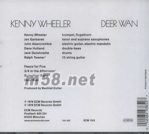 價格為估,以實到貨為準! KENNY WHEELER DEER WAN(m58.net) Kenny Wheeler曾經是英國自發藝術團體的骨乾成員,早年演奏的是猛烈恣肆的自由爵士作品,當1975年他作為樂隊掛頭牌者在ECM錄制專輯時,大家可以聽到他的聲音已經柔和平靜了不少。 柔號(Flugehorn),是爵士樂中一樣獨特的樂器,從字面翻譯這一樂器也可被稱作“翼號”,柔號的得名來自于它的音色,這一樂器通常被安排在大樂隊里演奏柔和舒緩氣氛的片段,聲音相當好聽,一般樂隊中都由小號手來兼任柔號手,Wheeler本來也正好是小號手。