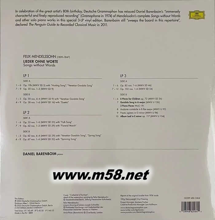 門德爾松無言的歌 LIEDER OHNE WORTE SONGS WITHOUT WORD 三黑膠套裝(m58.net) 門德爾松的《無言的歌》體現了他浪漫主義氣質,首首精致典雅、充滿詩情畫意,巴倫勃伊姆的鋼琴演奏長于樂句的表情處理,對旋律線的表現能力很強。他演奏的門德爾松的《無言的歌》全集最能體現其才華的作品,獲得極高贊譽。為慶祝巴倫勃伊姆80壽辰,特重新發行此黑膠。180克3黑膠。