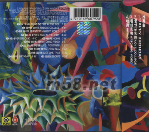01. 盒子內(nèi)的時(shí)間 02. 愛情研究院 03. 娛樂世界 04. 當(dāng)兵好 05. 綠卡 06. 暗藏 07. 看錄影帶 08. 生命共同體 09. 無(wú)影無(wú)隻 10. 就這樣 11. HAPPY BIRTHDAY 12. 逃脫