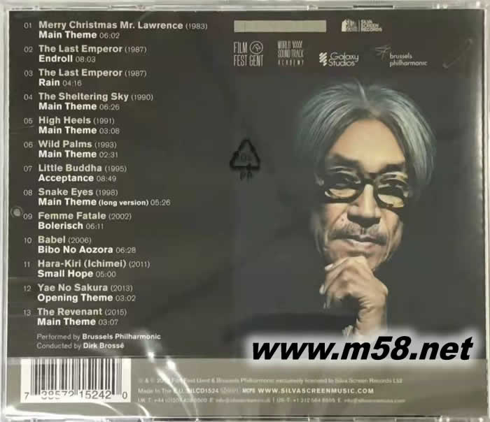 Music For Film 坂本龍一電影配樂全記錄(m58.net) 在這張CD中,收錄了他的電影配樂包括俘虜、末代皇帝、遮蔽的天空、高跟鞋、野棕梠、小活佛、蛇眼、雙面驚悚、火線交錯、一命、八重之櫻、神鬼獵人。天啊!除了一命與八重之櫻之外,其他幾部電影我全都看過,難怪聽這張CD時會覺得如此之熟悉。 這幾部電影的配樂都非常動聽,更棒的是這張CD是由布魯塞爾愛樂所演奏、Dirk Brosse指揮。可不要以為Dirk Brosse是無名小卒,他是作曲家,也是指揮家,作品超過200部,包括室內樂、協奏曲、交響樂、舞臺音樂、電影音樂等等。為何會有這張電影配樂呢?原來Dirk Brosse與布魯塞爾愛樂每年都會在比利時Gent電影音樂節頒獎典禮上現場演出獲獎的電影配樂,這個獎名為World Soundtrack Award。每年這個電影節都會在頒獎典禮舉行前,先行錄制該年獲獎的電影音樂作曲家作品,這張CD就是在這樣的情況下錄制的。 由于是大型管弦樂錄音,內中每首曲子都能表現出磅礡的管弦樂氣勢,以及厚實的低頻基礎,不僅弦樂細致屢屢分明,鼓聲捶打有如滾雷襲來,銅管的氣勢與厚度也很棒,更重要的是錄音音質很好。老實說,錄音效果這么優異的電影配樂并不是經常有,何況坂本龍一所寫的電影配樂可說是曲曲動聽,弦律優美,不像有些電影配樂老是單調的重復簡單的動機,聽久了很容易失去感動力。 這是坂本龍一第三度錄制這樣的電影音樂,前面二次我沒聽過,說不定也已經絕版了。請不要再錯過這張。
