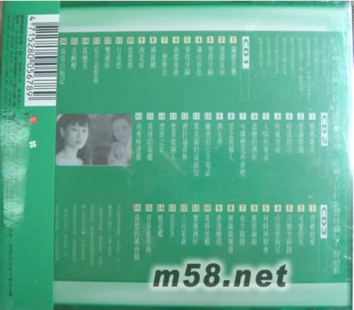 CD 1 1. 鑼聲若響 2. 港都夜雨 3. 望郎早歸 4. 滿山春色 5. 望你早歸 6. 南都夜曲 7. 三聲無奈 8. 補破網(wǎng) 9. 西北雨 10. 思想枝 11. 月夜愁 12. 雙雁影 13. 安平追想曲 14. 孤戀花 15. 青蚵嫂 16. 湯島白梅記者會 CD 2 1. 媽媽歌星 2. 港邊惜別 3. 暗淡的月 4. 秋風夜曲 5. 人客的要求 6. 悲戀的酒杯 7. 可憐戀花再會吧 8. 思念彼個人 9. 酒女夢 10. 離別的公共電話 11. 舊皮箱的流浪兒 12. 酒矸通賣無 13. 想著彼個人 14. 漂浪之女 15. 黃昏的故鄉(xiāng) 16. 再會呀港都 CD 3 1. 看破的愛 2. 可愛的馬 3. 月娘半屏圓 4. 山頂黑狗兄 5. 何時再相會 6. 舊情綿綿 7. 夜半路燈 8. 無緣做鴛鴦 9. 香港戀情 10. 黃昏思鄉(xiāng) 11. 鴛鴦酒杯 12. 六月茉莉 13. 丟丟冬 14. 桃花鄉(xiāng) 15. 青春悲喜曲 16. 哀愁的風雨橋