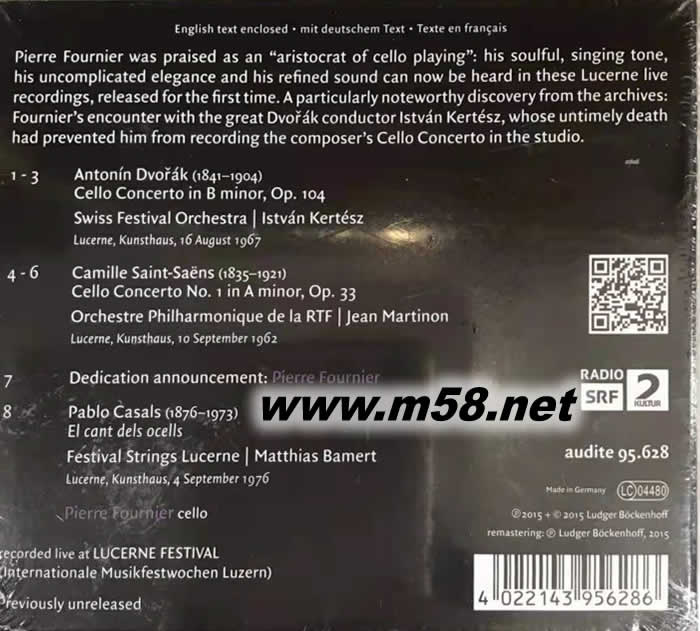 德佛札克/ 圣桑: 大提琴協奏曲/ 卡薩爾斯: 《白鳥之歌》DVORAK CELLO CONCERTO(m58.net) Pierre Fournier 傅尼葉 大提琴 Kertesz 克爾提斯/ Martinon/ Bamert 指揮 1967年琉森音樂節歷史名演 德國原裝進口