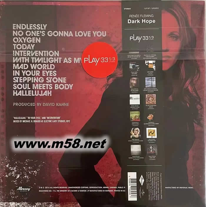 DARK HOPE 女高音 黑膠(m58.net) 蕾妮.弗萊明《DARK HOPE》 LP 現(xiàn)時最頂尖的抒情女高音的Renee Fleming,她的美聲和美貌令她成為各大歌劇院和音樂廳爭相邀請的歌劇唱家。而這張《Dark Hope》專輯,卻是演繹著她除了對歌劇之外的另一個愛好,用她特有的高音翻唱著著名流行歌曲。180克黑膠。