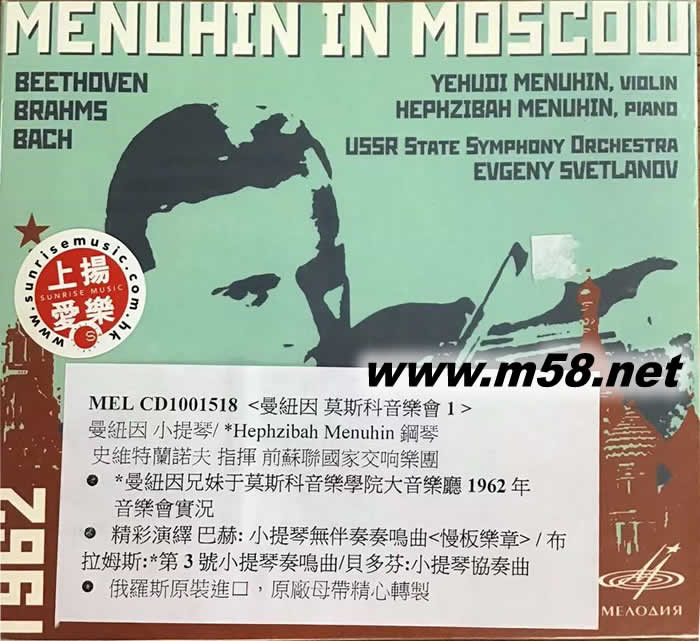 Menuhin in Moscow 曼紐因 莫斯科音樂會 1(小提琴、鋼琴協奏曲)(m58.net) Yehudi Menuhin 曼紐因 小提琴/ Hephzibah Menuhin 鋼琴】 / Evgeny Svetlanov 史維特蘭諾夫 指揮 前蘇聯國家交響樂團 曼紐因兄妹于莫斯科音樂學院大音樂廳1962年音樂會實況 精彩演繹 巴赫: 小提琴無伴奏奏鳴曲<慢板樂章> / 布拉姆斯:*第3號小提琴奏鳴曲/貝多芬:小提琴協奏曲 俄羅斯原裝進口,原廠母帶精心轉製