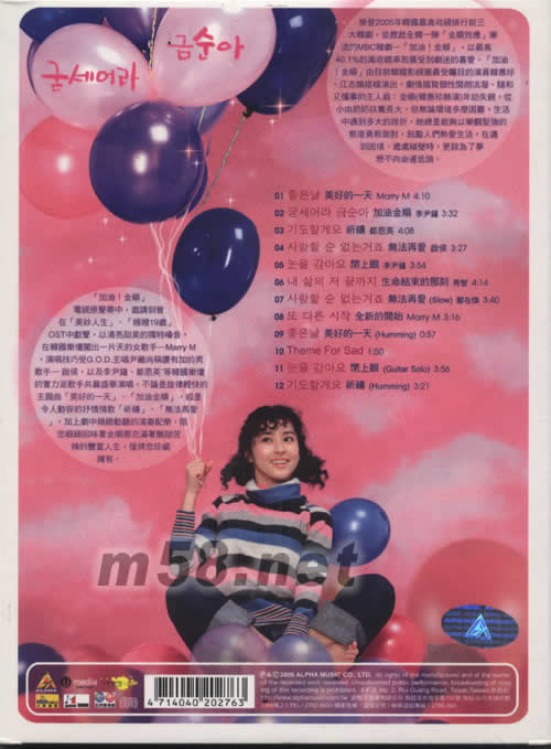 [加油!金順]電視原聲帶中,邀請到曾在[美妙人生]、[嫂嫂19歲]OST中獻聲,以清亮甜美的獨特嗓音,在韓國樂壇闖出一片天的女歌手--Marry M,演唱技巧受G.O.D.主唱尹繼尚稱贊有加的男歌手--啟侯,以及李尹鐘、都恩英等韓國樂壇的實力派歌手共襄盛舉演唱。不論是旋律輕快的主題曲[美好的一天]、[加油金順],或是令人動容的抒情情歌[祈禱]、[無法再愛],加上劇中精致動聽的演奏配樂,陪您細細回味著金順那充滿著酸甜苦辣的豐富人生,值得您珍藏擁有。