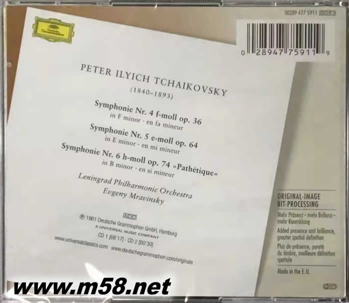 柴可夫斯基:4,5交響曲 雙CD TCHAIKOVSKY SYMPHONIES NOS.4 5&6 大禾花版 雙CD(m58.net) 埃費吉尼?穆拉文斯基(Eugene Mravinsky,1903—1988),前蘇聯著名指揮家。 在前蘇聯時期和現在的俄羅斯指揮家中,穆拉文斯基是元老人物,名望最高,功績最大,被列為20世紀最偉大的指揮家。 綜觀其一生,穆拉文斯基最大的功績就是造就了一支世界一流的樂團——前列寧格勒愛樂樂團。這支樂團氣質之好、音質之純、演繹之優、音色之清、音響之佳、氣魄之大、感染力之強,完全可與世界上任何超級樂團相媲美,而這了不起的成就正是穆拉文斯基一手訓練出來的。在他廣泛的曲目中,最為人稱贊的是他對俄羅斯作品的演繹,那款《柴可夫斯基:Nos.4,5 & 6 交響曲》,是歷史上的經典之作,至今仍是后世之楷模。