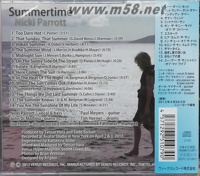 Summertime夏日時(shí)光(m58.net) 繼專輯《櫻花戲春》后,性感可愛(ài)的妮基.派洛特以《夏日時(shí)光》與樂(lè)迷一起迎接夏天! 序曲性感俏皮的「Too Darn Hot」,為夏天展開(kāi)火熱的序幕,「That Sunday, That Summer」如夏夜般沁涼悠閒,爵士經(jīng)典名曲「Summertime」在妮基.派洛特沙啞曼妙的嗓音詮釋下,為《夏日時(shí)光》增添了更多勾人心弦的柔情風(fēng)采。 Nicki Parrott - vocal & bass John Di Martino - Piano Lisa Parrott - Soprano And Bariton Saxophones Paul Meyers - Guitar Tim Horner - Drums Dominick Farinacci - Trumpet