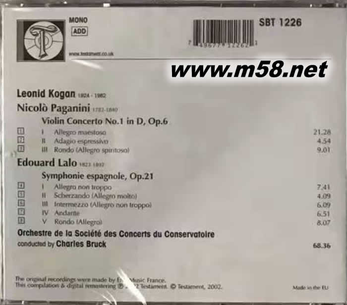 帕格尼尼:第1號(hào)小提琴協(xié)奏曲/拉羅:西班牙交響曲 Paganini: Violin Concerto No.1 & Lalo: Symphonie espagnole(m58.net) 柯崗 小提琴 / BRUCK指揮 法國(guó)音樂院管弦樂團(tuán) 俄羅斯小提琴大師傳世名版 黃金陣容組合,絕對(duì)珍藏 英國(guó)原裝進(jìn)口; EMI原廠音源精心轉(zhuǎn)製