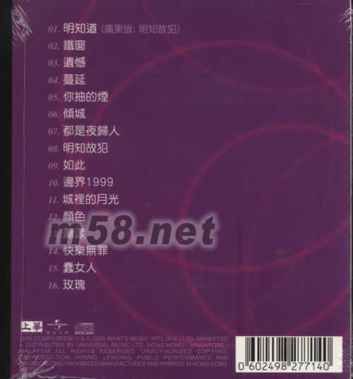 01. 明知道(廣東版:明知故犯) 02. 鐵窗 03. 遺憾 04. 蔓延 05. 你抽的煙 06. 傾城 07. 都是夜歸人 08. 明知故犯 09. 如此 10. 邊界1999 11. 城里的月光 12. 顏色 13. 蕩漾 14. 快樂無罪 15. 蠢女人 16. 玫瑰