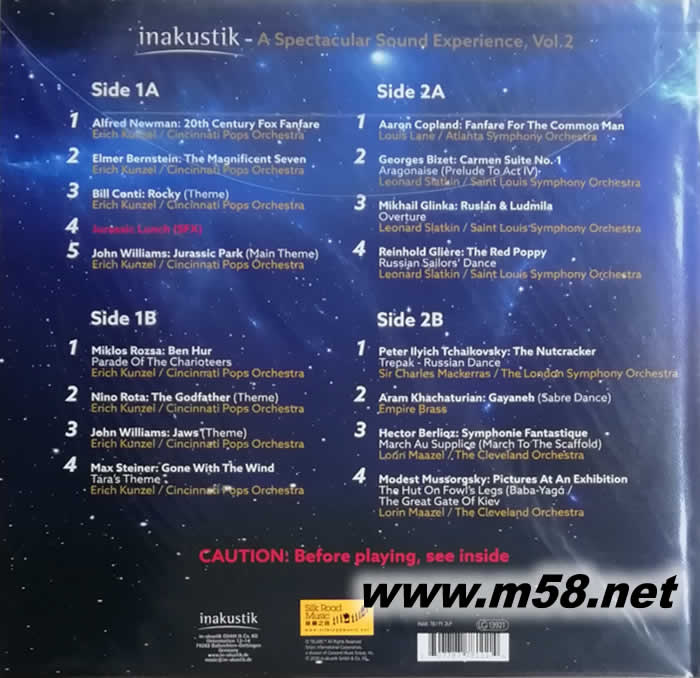 1. Alfred Newman : 20th Century Fox Fanfare Erich Kunzel / Cincinnati Pops Orchestra 2. Elmer Bernstein : The Magnificent Seven Erich Kunzel / Cincinnati Pops Orchestra 3. Bill Conti : Rocky (Theme) Erich Kunzel / Cincinnati Pops Orchestra 4. Jurassic Lunch (SFX) 5. John Williams : Jurassic Park (Main Theme) Erich Kunzel / Cincinnati Pops Orchestra 6. Miklos Rozsa : Ben Hur Parade Of The Charioteers Erich Kunzel / Cincinnati Pops Orchestra 7. Nino Rota : The Godfather (Theme) Erich Kunzel / Cincinnati Pops Orchestra 8. John Williams : Jaws (Theme) Erich Kunzel / Cincinnati Pops Orchestra 9. Max Steiner : Gone With The Wing Tara’s Theme Erich Kunzel / Cincinnati Pops Orchestra 10. Aaron Coplannd : Fanfare For The Common Man Louis Lane / Atlanta Symphony Orchestra 11. Georges Bizet : Carmen Suite No.1 Aragonaise (Prelude To Act IV) Leonard Slatkin / Saint Louis Symphony Orchestra 12. Mikhail Glinka : Ruslan & Ludmila Overture Leonard Slatkin / Saint Louis Symphony Orchestra 13. Reinhold Gliere : The Red Poppy Leonard Slatkin / Saint Louis Symphony Orchestra 14. Peter IIyich Tchaikovsky : The Nutcracker Trepak – Russian Dance Sir Charles Mackerras / The London Symphony Orchestra