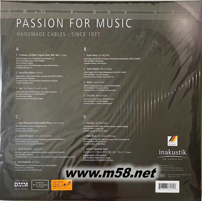 線王-音樂的熱誠 Passion For Music inakustik 45轉 雙黑膠(m58.net) 1. 從1977年開始,有線王之稱的德國“原音”公司(in-akustik)以制造高質素的專業音響接線馳名于世,同時其錄音制作亦以極高嚴格要求見稱,軟、硬體產品經常有緊密及互動性的活動和項目以配合市場宣傳推廣的目的,冀能得到相得益彰的效果。 2. 繼‘線王-聲效鑑試盤(in-akustik Soundcheck)’和‘音準對比測試鑑聽(Reference Sound Check)’兩張鑑試專輯獲得空前成功,口碑載道,“德國原音”再接再厲,精心炮制最新一輯鑑聽盤‘線王-音樂的熱誠(Passion For Music - inakustik)’以提供追求完美音質和音效的“發燒友”用作測試其音響設備特別是導線的表現,同時亦能欣賞令人回味無窮的美麗樂曲。 3. 專輯精挑了十四首錄音技術優異,演唱和演奏者表現出色,旋律優美的樂曲。這些樂曲同時亦能鑑聽和測試器材設備的中、高、低音,空間感,解像度,動態范圍,音場的平行和人聲及各種樂器聲的表現和效率等,但音樂欣賞價值極高。 4. 先進優秀的錄音技術,配合自然真實,極高水平的演唱和演奏,這鑑定盤是科技與藝術的優越之作。加上以45轉180克雙黑膠盤為載體,直刻金屬母盤(Direct Metal Mother)由發燒界另一巨擘“老虎魚”負責制作,展現前所未有的聲音美感,效果更趨完美。