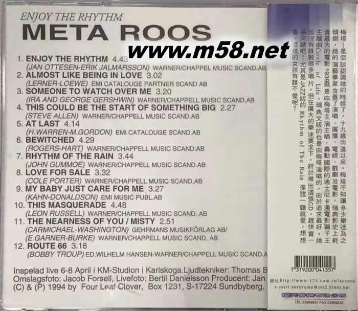 梅塔:愛上梅塔 Meta Roos: Enjoy the rhythm(m58.net) 她像是永遠都在歌唱的女孩,她像是穿著紅舞鞋跳個不停的女孩,梅塔,你應該要認識她,她的歌聲可以融化冰冷的冬雪,自從十九歲出道以來,不知讓多少樂迷傾倒,她的演藝事業(yè)涵蓋了演唱,廣播,電視,戲劇,及電影,瑞典影史上耗資最大的史詩電影1939就是由梅塔主演主唱,而轟動國際的迪士尼卡通《獅子王》瑞典版主題曲「Circle of Life」,也是由梅塔擄獲所有小孩子的心。 這張愛上梅塔中,收錄了爵士樂名曲「待沽之愛」,還有「雨中旋律」,以及多首瑞典最受歡迎的,摻了北國口味的英語歌曲。最重要的是,梅塔那歌唱時專注的神情,似乎可以從錄音中聽見她的陶醉。完美主義者的梅塔,並未灌錄很多專輯,但是每一張必定都是最棒的,一點點的爵士味道,一些些夜晚北國小酒館中的熱情,還有和著冷空氣的沁涼,小心,別愛上梅塔,因為你的情敵太多了。